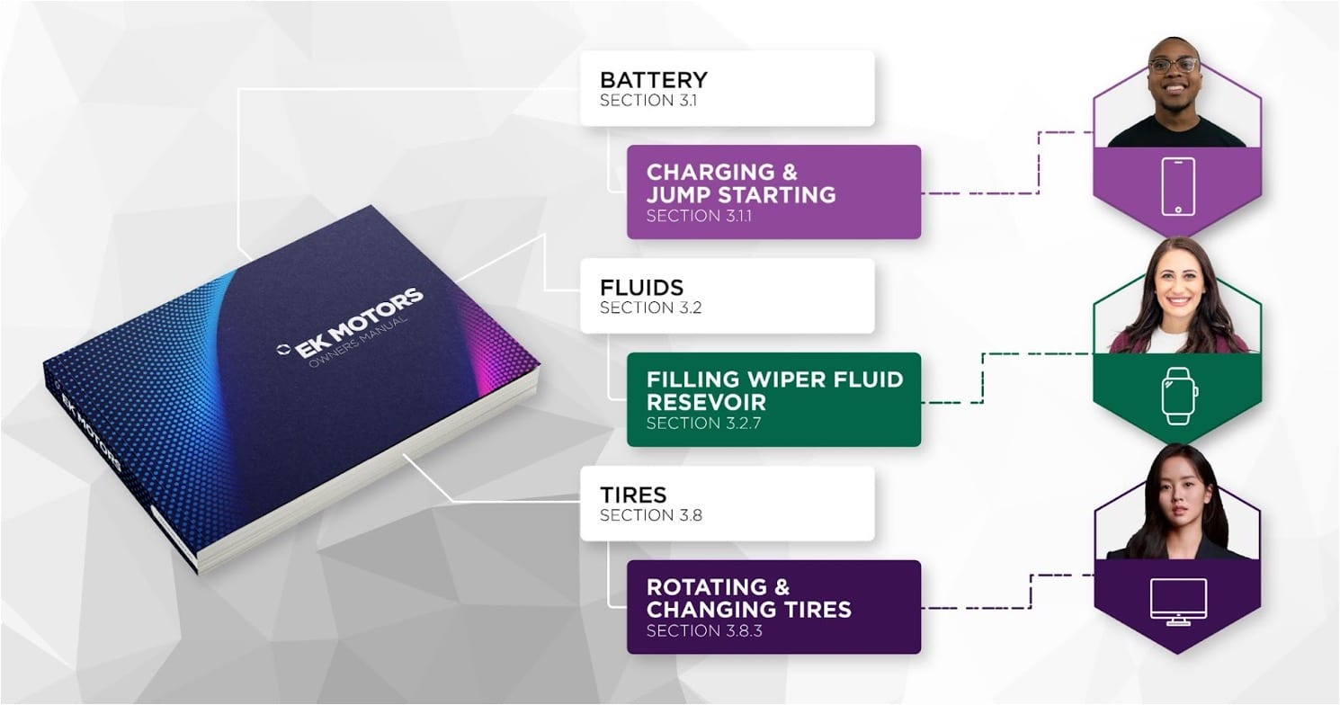 A CCMS supports the content side of the personalization equation. It allows organizations to author and manage content in components or sections rather than long documents. Componentized content is structured content that represents a portion of a larger document (typically a chapter or section) that can be combined to build documents dynamically. A great example of this is your car’s owners manual. This manual has instructions for changing a tire, filling the wiper fluid, and jump starting the car. Dividing the content of the owners manual into components allows the manufacturer to send only the jump starting instructions when that is what the customer needs.