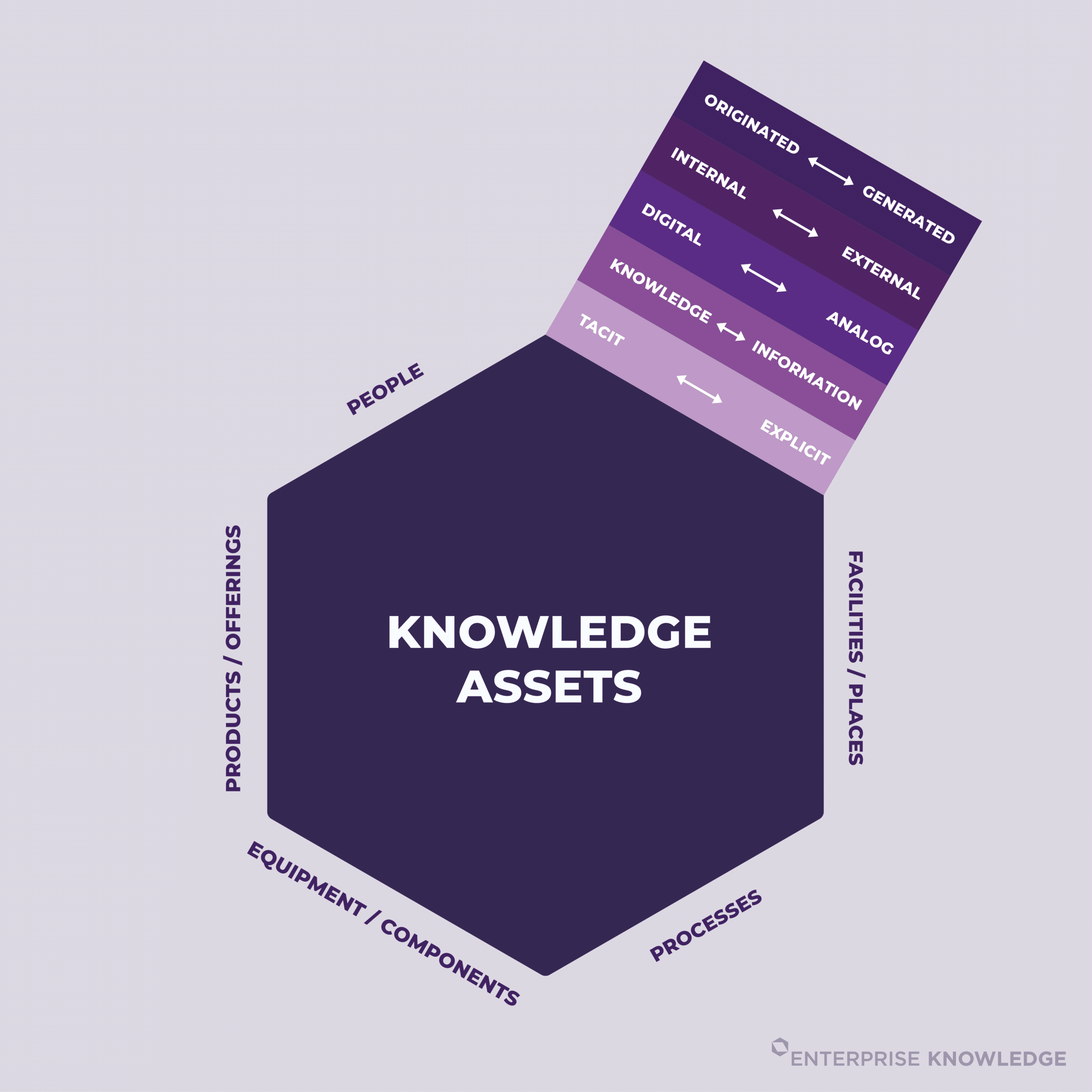• Tacit and Explicit – Tacit content is held in people’s heads. It is inferred instead of explicitly encoded in systems, and does not exist in a shareable or repeatable format. Explicit content is that which has been captured in an independent form, typically as a digital file or entry. Historically, organizations have been focused on converting tacit knowledge to explicit so that the organization could better maintain and reuse it. However, we’ll explain below how the complete definition of a knowledge asset shifts that thinking somewhat.